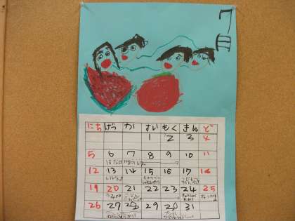 7月のカレンダーを作りました。7月といえば,大好きな水あそび,七夕,夏休み,スイカやトマト…おいしいものがいっぱい,5年生は山の家。いろいろ描きたいものがある中,自分の一番描きたいものを選びました。