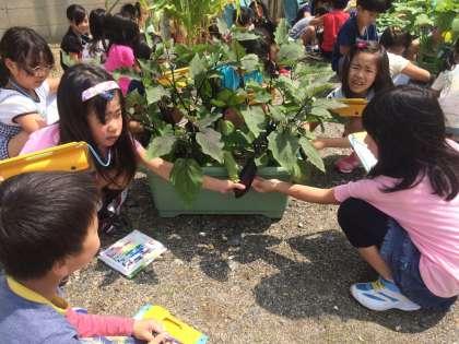 子どもたちの手のひらよりも大きいナスが,たくさん実っていました。