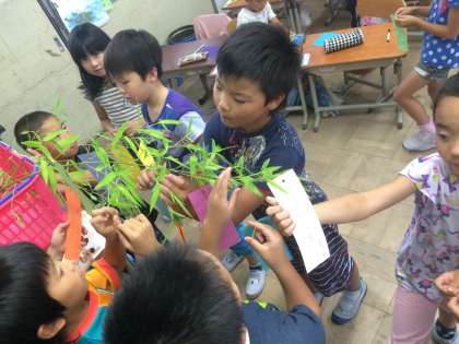 今日の図工の時間は,「ぼうしをかぶって」活動について確認をした後,七夕の飾りを作りました。