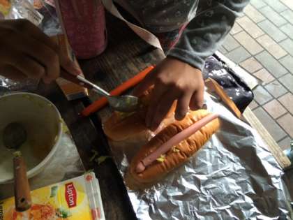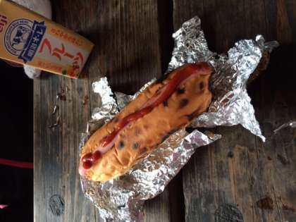 パンにキャベツとソーセージをはさみ、アルミホイルで巻きます。