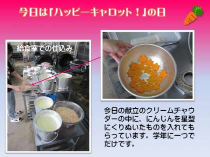 今日は「ハッピーキャロットの日」でした。活躍してくれたのは給食調理員さんたちです。今日の献立の一つ『クリームチャウダー』に入れるにんじん。そのにんじんを星型に切って茹でたものをいくつか用意しておき,学年に一つだけ入れておくのです。給食の時に,めでたくその星型キャロットが入っていた子どもには,給食調理員さん手作りのかわいい『しおり』がもらえることになっています。