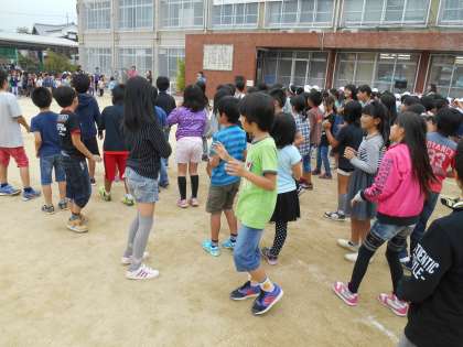 10月1日(木)に運動場で英語集会がありました。英語の歌を歌ったり,動作を付けたりしながら英語に親しんでいました。総合的な学習で英語の学習をしているおかげで,聞き取れる単語を頼りに活動に取り組むことができました。