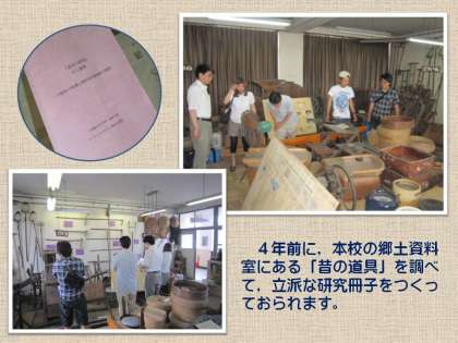 本校の南校舎3階には,とても立派な郷土資料室があります。この郷土資料室は,1985年度に地域の方々の協力を得て設置されました。その後拡充が図られ,授業などにも役立てられています。今後,社会科の研究の進展にあわせて,さらに整理していく予定です。民具の中には,「天保七歳申九月日」(1836年)の銘があるものもあります。