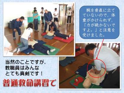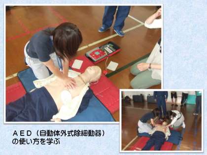 心臓マッサージは,体重をうまくかけないと力が入りにくく,救急隊員が来るまでの7、8分間続けようとするなら,姿勢を十分に考えなくてはなりません。またAEDは音声ガイドもあって手順はよくわかるのですが,スイッチを入れて電気ショックを加える時には,傷病者から30センチ以上は離れていないといけないのだそうです。慌てず慎重に取り組まねばならないことを確認しました。