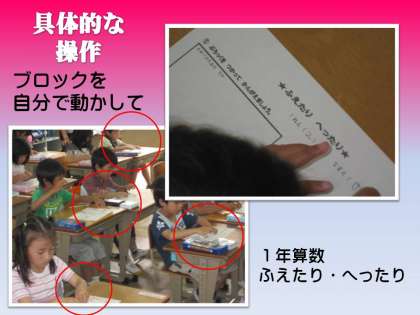 ここでは,まず一人一人の子どもが,数図ブロック(おはじき)を使って,実際に操作することが大切です。自分が実際に動かさなければならない。手を動かして,数が「ふえたりへったり」する様子をとらえなければなりません。