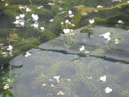 ふれあい広場の池に咲くこの花を知っていますか?「オオカナダモ」という藻の花です。3枚の花びらがとってもかわいいですよ!ついでに池の中をのぞいてみましょう。メダカの稚魚がいっぱいいますよ。