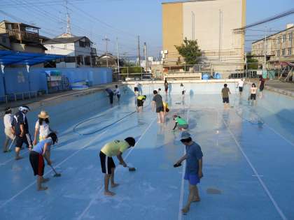 6月10日(木),職員会議の後に教職員全員でプール掃除の仕上げをしました。プールの隅やオーバーフローの溝などを洗剤をつけたたわしで念入りに掃除しました。昨日6年生が頑張ってくれたので短時間できれいになりました。最後に塩素消毒をして終了。みなさんご苦労様でした。