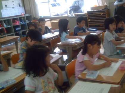 1時間目の算数は,習いたての足し算の練習をしました。難しい時はブロックを使って取り組みました。国語は,ひらがなを全部学習したので,51音表を練習しました。40分程度でしたが一生懸命に取り組む姿が見られました。