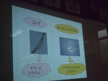 身長・体重を計る前には,保健室の由田先生からアタマジラミについてプロジェクターで写真を映しながら,説明してもらいました。