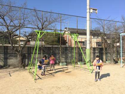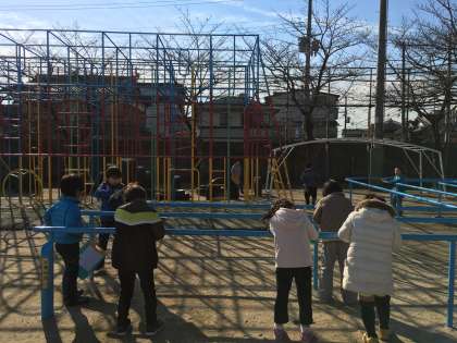 運動場にあるものの中から自分が一番書きたいと思うものを選びました。鉄棒,総合遊具,ブランコなどを絵に描き,その色や形などの特徴や,遊び方を言葉で書き加えます。同じものを選んだ友達と書いたものを見せ合ったり,色をぬったりして中身を充実させました。
