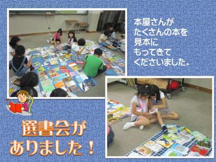 本屋さんから借りた本がいっぱい並べてあり,自分が図書室に置いてもらいたい本を選びます。たくさんの本が並んでいるだけでも,何だか心がうきうきします。読書することの大切さを心でしっかり確かめたい場面でもあります。