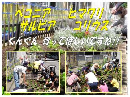 24日(木)の昼休み,「学校運営協議会こころ部会」の園芸ボランティアさんと園芸委員会のこどもたちが協力して,中庭の花壇で花の植えかえをしてくれました。ヒマワリやベコニア・コリウス・サルビアの4種類の苗を丁寧に植えてくれました。花壇は一気に夏の花壇に大変身。枯れないように水をしっかり与えて,ぐんぐん育つて欲しいですね。