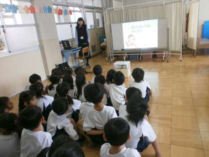 今日ははじめての保健室ではじめての身体計測です。保健室の中澤先生にお話を聞きました。「ありがとうございました。」「失礼します。」しっかり練習できました!