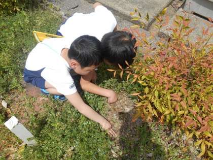 虫めがねをもって中庭やふれあい広場で自然の観察をしました。