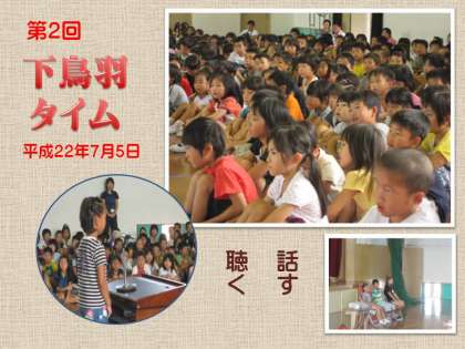 今日5日は,7月の“下鳥羽タイム”が実施される日です。コの字型になって,お互いが見えるように並んで座った子どもたち。この季節,体育館の中は朝から大変暑かったのですが,みんなは代表の子どもたちの発表をしっかり聴くことができました。