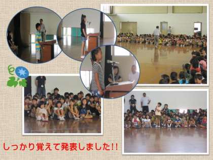 1年生の代表の子は,かなりの長文を暗記して話すことができました。しかも話し方がとても上手でしたよ。がんばりましたね。4年生と5年生の代表の子どもも,それぞれ社会科や理科で学習したことをもとに話しました。「リサイクルの必要性」「生命の大切さ」など,自らのくらしや生き方の中で,学習したことをどう生かそうとしているのかがよくわかる作文でした。