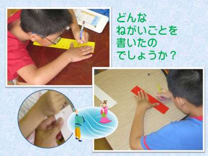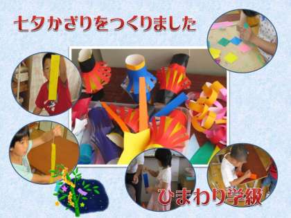 今日,ひまわり学級では,七夕かざりをつくりました。折り紙を切ったりはったりして,いろいろなかざりを作りました。また短冊に願い事を書きました。みんなのがそろったら,笹につるそうと思っています。また見にきてくださいね。