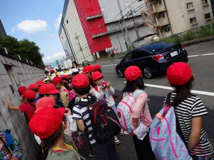 まずはバスで京都駅に向かいしました。そこから京都鉄道博物館を目指します。子どもの足で約30分。2列に並んでしっかりと歩きました。