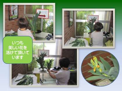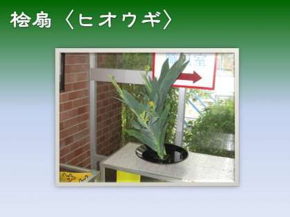 管理棟の玄関に,いつも地域の方が花を活けてくださいます。今日,美しく活けていただいている様子を見せて頂いていると,これは「桧扇〈ヒオウギ〉」といわれる花だと教えて頂きました。