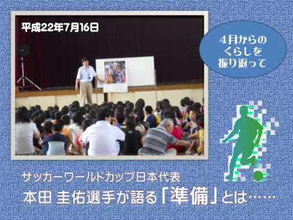 サッカーワールドカップの日本代表,本田 圭佑選手は,小学校の卒業文集に「ワールドカップに出場できるサッカー選手になる。」ことを書いています。みなさんと同じ小学生の頃から目標をもっていて,それを見事に実現した訳です。本田選手はインタビューなどでさかんに「準備」という言葉を使います。「次の試合に向けて最高の準備をしたい。」「僕は準備をすることが最も大切なことだと思う。」「しっかり反省して準備をしたい。」などと語っているのです。しっかり準備をすることで,人は初めて頑張れる。準備が十分できていなかったのに、精一杯やったとは言えない。そんなメッセージを感じるのです。みんなはどうだったでしょう。みんなにとって「準備」とは何なのでしょうか。