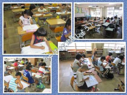 朝は学習会も行っています。みんな真剣にドリルに取り組んでいます。この学習会の時間に一生懸命に取り組むことは,もちろん大切なことですが,何より,これは家での学習習慣を身に付けるきっかけになればと思い,実施しているものなのです。長い夏休みの間,それぞれの家庭で毎日少しずつ学習できる習慣がつくこと。これが大事なのです。受け身になってばかりではいけません。自分から学習する姿勢を身につけましょう。