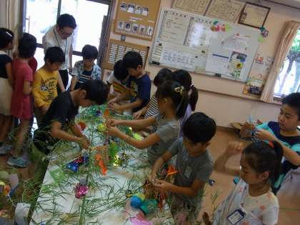 7月5日(火)に1組とひまわり学級は1・2時間目に,2組は3・4時間目に総合の学習で鳥羽ホームに行ってきました。もうすぐ七夕ということで,入所者のみなさんと一緒に短冊に願い事を書いたり,飾りつけをしたりしました。その中で,とても楽しそうに話をしていたのが印象的でした。