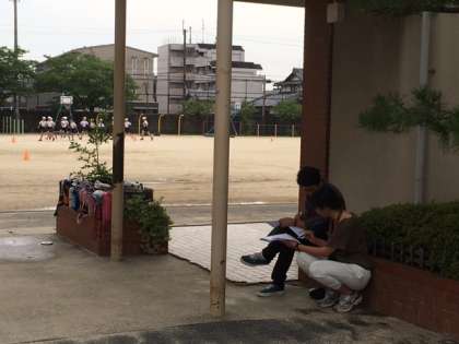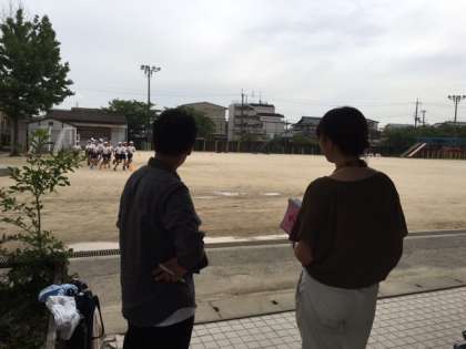 またまた,陸上部担当のM元先生とM尾先生が走っている子どもたちを見つめています。