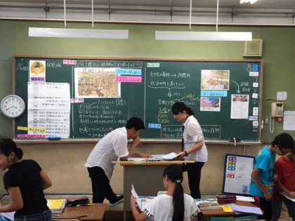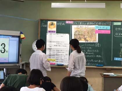 6年2組の社会科の授業の後の様子です。今日は「3人の武将と天下統一」の単元の学習をしていましたが,授業後に6年生の先生が2人で何やら話をしています。