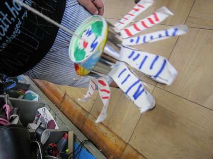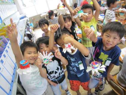 紙コップをプロペラのように加工して、思い思いの飾りを付けました。