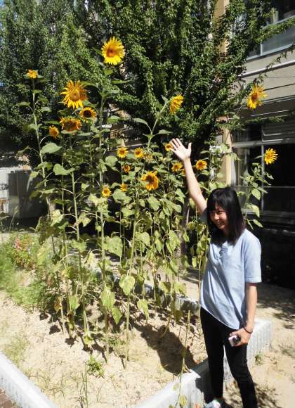 ひまわりは,先生よりも背が高く育っていますよ!!