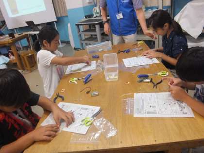 回路を作る作業に手こずる子どもたち。