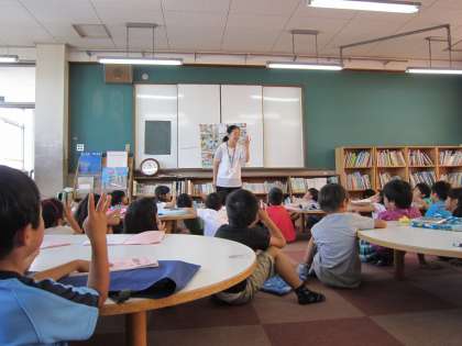 図書室から図書館に呼び方が変わること、本が10のグループに分類されていること、図書館の正しい利用の仕方など、図書館についてのお話を聞かせていただきました。