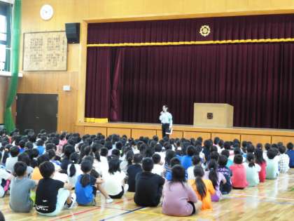 避難訓練の様子を伏見署のスクールサポーター方が見に来てくださいました。また,係長さんからは安全についてのお話をしていただきました。