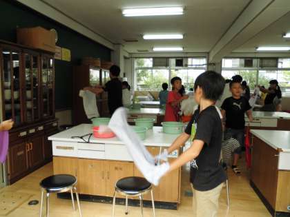 家庭科室では,6年生がTシャツをパタパタしています。何をしているのかと思えば,家庭科の学習で洗濯をしているのでした。Tシャツを洗って,しぼって,ハンガーにかけて・・・みんな,うまくできましたか?