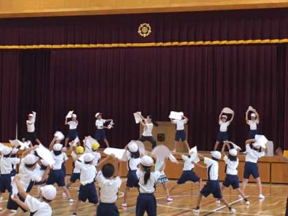 9月26日(月)2校時 2年生「花笠音頭」の練習,子どもたちの手には白いものが・・・。