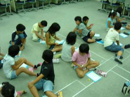 上の写真は,食事係の活動です。野外炊事で「すき焼き風煮」を作ります。作り方を模造紙に書いて,みんなが作りやすいようにします。また,各班のテーブルに置く名札を作っています。少しぐらい風が吹いても倒れないように木材を切り取ったものを使います。