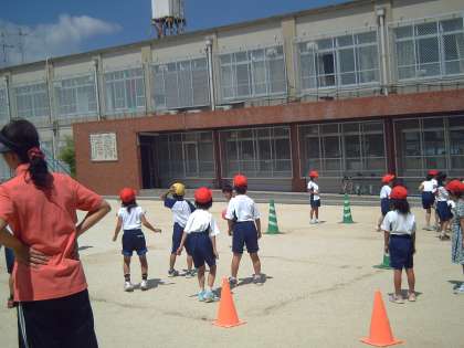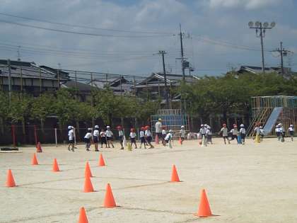 現在体育の学習では,ころがしドッジボールをしています。普通のドッジボールとは違い,ボールを転がして相手にあてます。また,前後半で攻守が入れ替わるので,1年生でもルールがわかりやすいドッジボールになっています。
