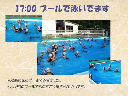 そのあとは、身体の潮を落とす意味もあって、プールで水泳です。焼けた身体を冷やしておきましょう。お腹をすかせたら、次は夕食です。