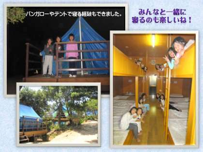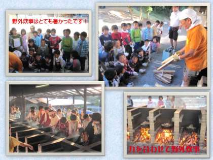 夜の活動の様子も伝えます。初めてテントやバンガローで泊まった子どもたちも,いたのではないでしょうか。野外炊事では,大きくなった炎で,さすがに暑かったです。