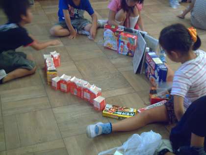 そのうちに,想像が膨らみ,どんどん立体的なものをつくりはじめていました。様々な材料を組み合わせたり,くっつけたりするのはなかなか難しいようで,何度もくりかえしながら作っていました。広い床で十分に想像を膨らませて創作活動ができたと思います。