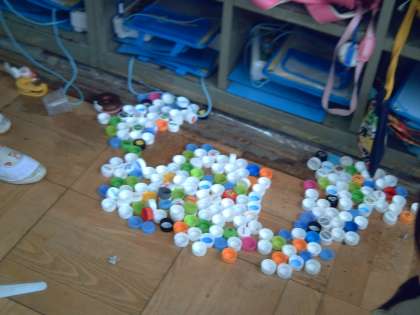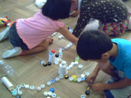写真2:ペットボトルキャップをたくさん使って迷路のように道をつくりました。