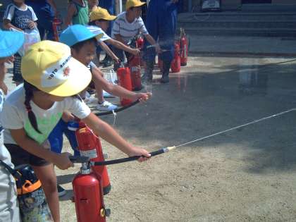 2時間目からは,防災について様々なコーナーを体験しました。地震の疑似体験コーナー,消防士の制服を着るコーナー,消化器を使ってみるコーナーと子どもたちの興味がわくようなものがたくさんありました。