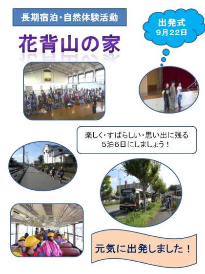 9月22日(水),爽やかな秋晴れの日となりました。5年生の子どもたちが待ちに待った「長期宿泊・自然体験活動」出発の日です。出発式では「今日から始まる5泊6日の活動をがんばりましょう!」「心に残る活動にしましょう!」と,代表児童の力強く気持ちの良い挨拶がありました。みんな元気に出発しました。