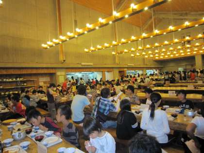 最初の夕食は,山の家の中にある食堂でとりました。この食堂ではバイキング方式でおかずを取ることができます。生野菜も,欲しいだけたっぷり戴くことができますよ。子どもたちは,何度かおかわりをしながら,満足いくまで食事を楽しんでいました。