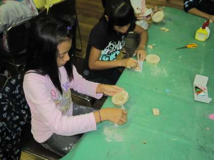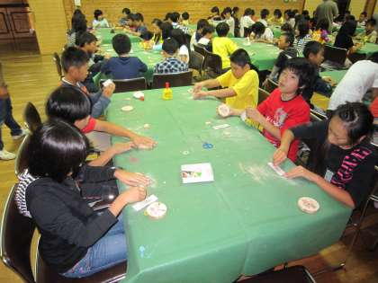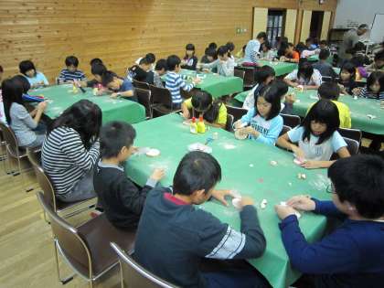 雨のため室内の活動に切り替えています。今,子どもたちは「ウッド写真立てつくり」に取り組んでいますよ。山の家の先生の指導を受け,みんな一生懸命になっています。作品が出来上がったら,山の家からのいい記念品になりそうですね。どんな作品が出来上がるのかな?楽しみです!
