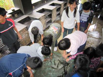 予定では,所内の小さな川を堰きとめて,そこに入って魚を追いかけるはずでしたが,折からの激しい雨のため,変更となりました。大きなたらいの中を泳ぐ魚を手づかみでとることになったのです。ちょっと迫力には欠けますが,初めて魚を素手でつかんだ子もいて,なかには大きな声をあげての体験となりました。魚は清流に住む川魚のイワナでした。