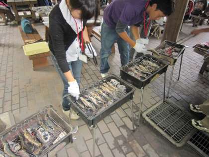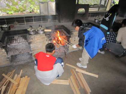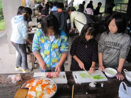 教員たちが魚を焼くのと並行して,子どもたちは野外炊事の活動を行いました。メニューは「豚汁」と「ご飯」です。もちろん魚の塩焼きも頂きます。火を起こす子も,「豚汁」の材料を切る子も,そして「ご飯」を炊く子も,みんなが夢中で取り組みました。