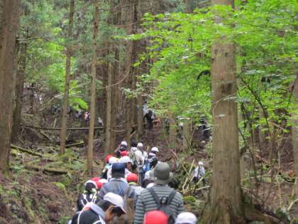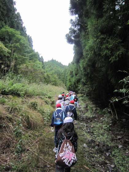 遠くから見る山の様子と,実際に登山道を歩いてみるのとでは,印象が大きく違いますね。最初の登りには,思わず子どもたちも身構えたでしょうか。しかし,大きく遅れる子もなく,まずは最初の休憩地点である『寺山峠』へと向かいました。