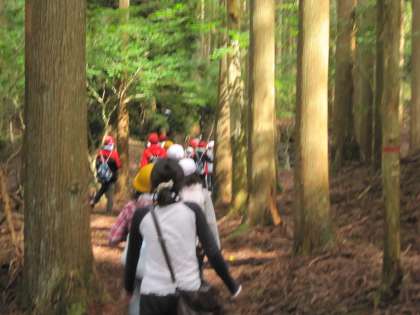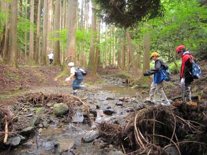 木々の間をさわやかな風が吹き抜ける中,快適な山登りをしています。付近を流れる小川の水も大変清らかです。実際に歩いてみないと,なかなか味わえません。歩きながらのおしゃべりが楽しい子どももいます。