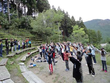 山の家 4日目の朝を迎えました。5年生の子どもたちは大変元気です。昨日の雲取山登山の疲れも見せず,みんな元気に「朝のつどい」を行いました。今朝は,風がきつく少し肌寒いですが,ラジオ体操で眠い体をしっかり起こしました。山の家4日目のめあては,「友情・感謝」です。友達との絆を深め,友達や家族・家族,そして自分の周りにいる人に感謝する気持ちを抱きながら,今日の活動に取り組んでいきます。朝のつどいでは,昨晩からお手伝いをしている学生ボランティアの米田さんと本田さんの紹介もしました。